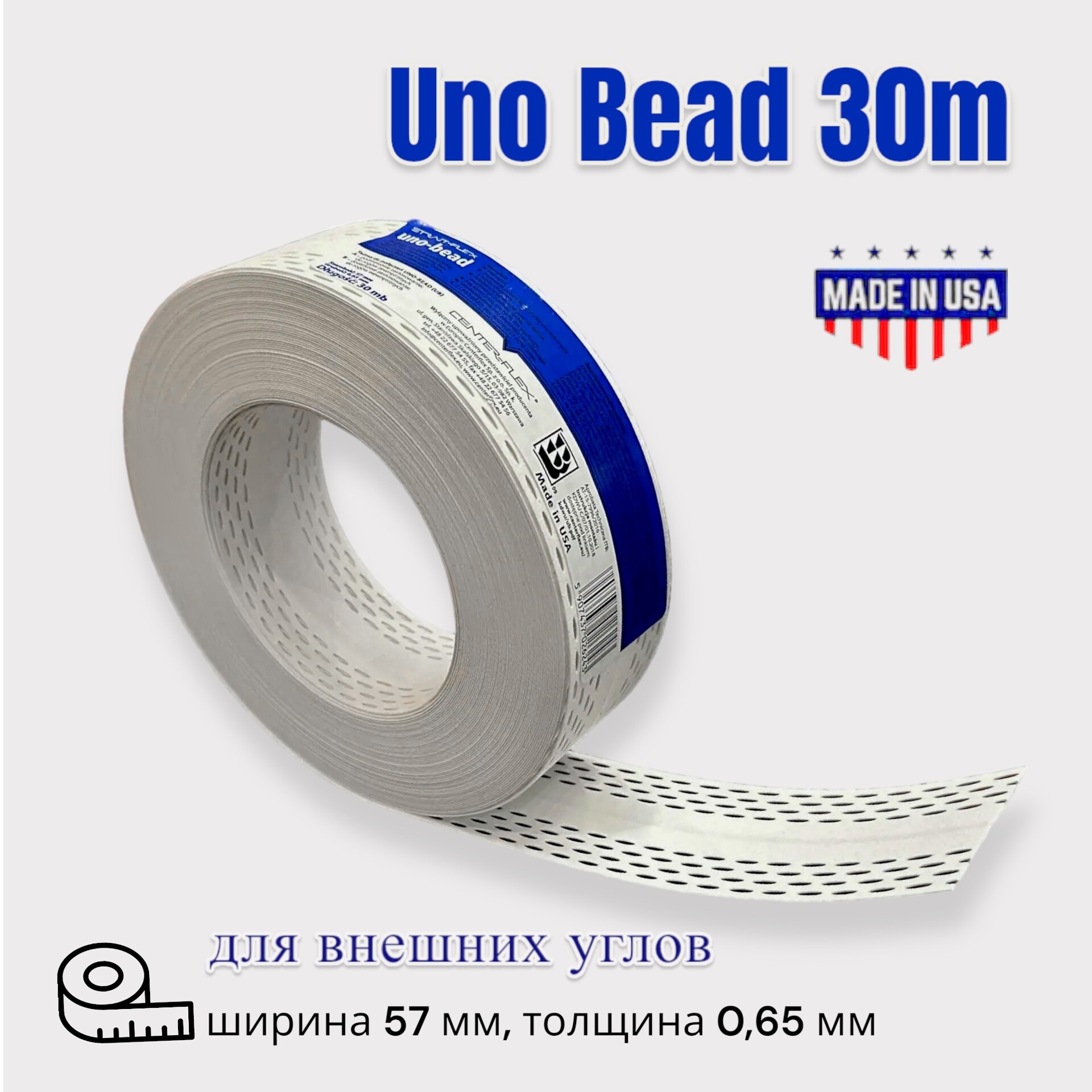 Углоформирующая лента Strait Flex Uno Bead намотка 30 метров, Производство США! Предназначена для формирования и армирования внешних углов на стенах и потолке! Очень прочный и устойчивый к повреждениям и трещинам, предназначен для наружных углов. Армирующая лента UNO-BEAD идеально подходит для соединения гипсокартонных листов на внешних и внутренних углах. Внешний угол получается острым что придает очень красивый вид, а так же очень прочным.