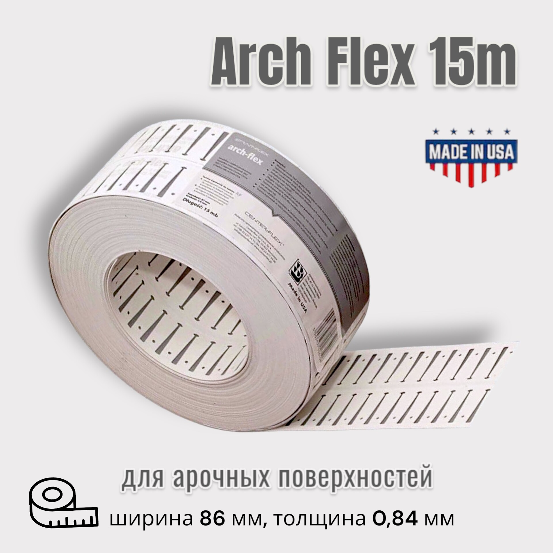 Лента ARCH-FLEX, арочный, линейный, армирующий композитный профиль в рулоне 15м. Ширина 86мм. Толщина 0.84 мм. Формирует геометрически правильную и прочную кромку арочных проемов и других криволинейных конструкций... Предназначена для извилистых углов. Позволяет создать идеальную изогнутую линию без каких-то либо швов. Лента ARCH-FLEX имеет отверстия с обеих сторон ленты. Узорчатый материал легко отрывается и когда он полностью удален, Вы можете изгибать его как Вам угодно, на любых поверхностях с различными углами. ПРЕИМУЩЕСТВА В СРАВНЕНИИ С ОБЫЧНЫМ МАТЕРИАЛОМ: