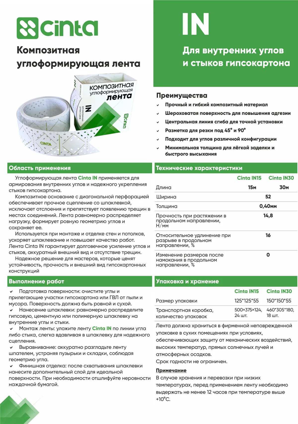 Углоформирующая лента Cinta IN специально разработана для формирования безупречно ровных внутренних углов и крепких стыков ГКЛ. Благодаря композитному материалу лента легко монтируется и обеспечивает точную геометрию на протяжении всего срока службы. Клеиться на финишную полимерную шпаклевку.